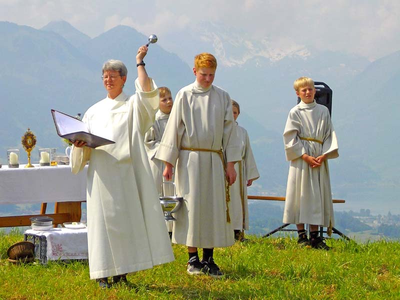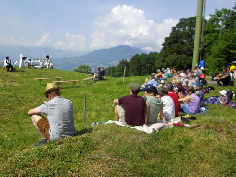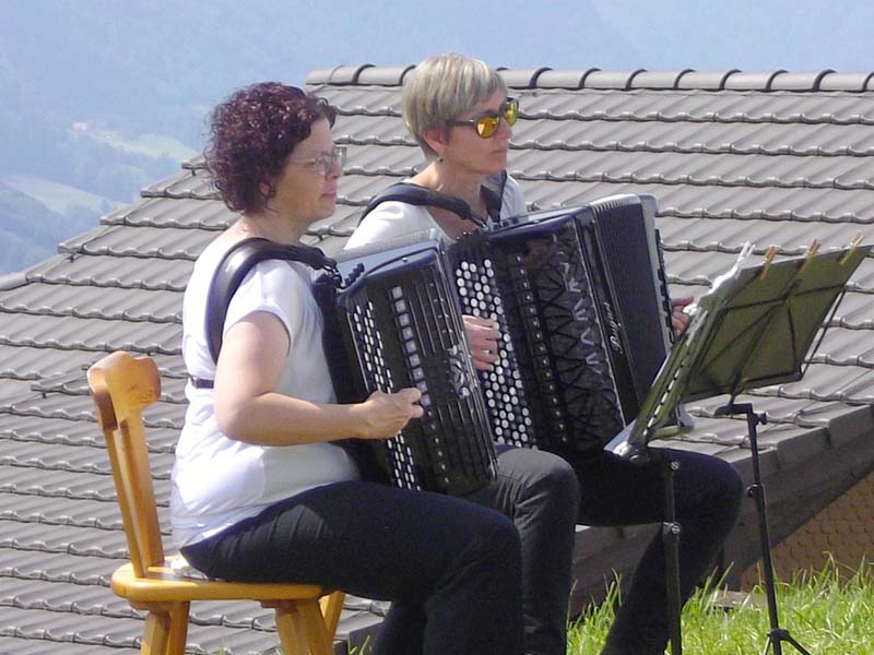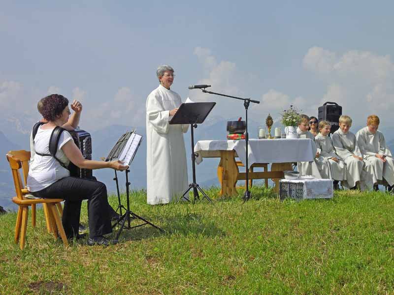 Mit stimmigen Gedanken führte Astrid Elsener durch den Gottesdienst und die beiden Musikantinnen, Corinne Frunz und Sabine Müller, bereicherten diesen mit ihrer fröhlich-bunten Musik. Mit dem Flur- und Wettersegen und heuer am Dreifaltigkeitssonntag zudem mit der Salzsegnung endete der traditionelle Feldgottesdienst auf dem Mueterschwandenberg. Im Anschluss verweilten die Gottesdienstbesucher bei Grilladen, Kaffee und munteren Gesprächen.