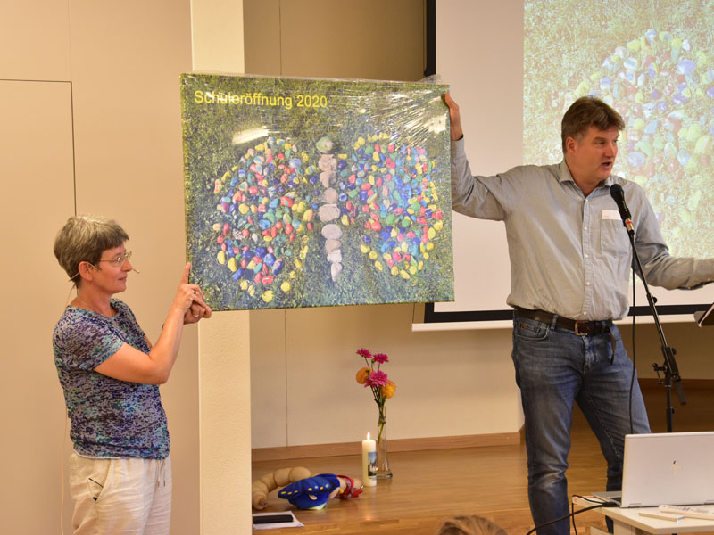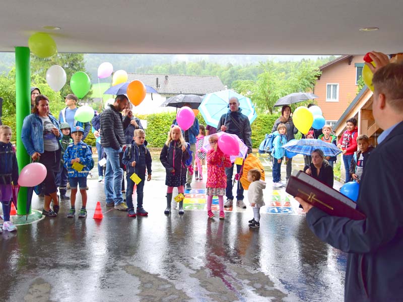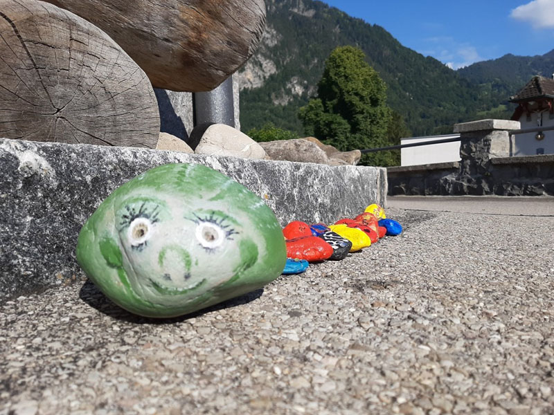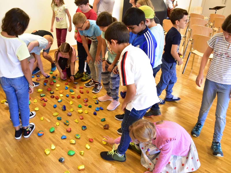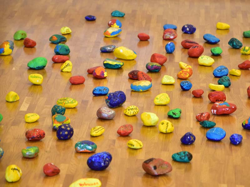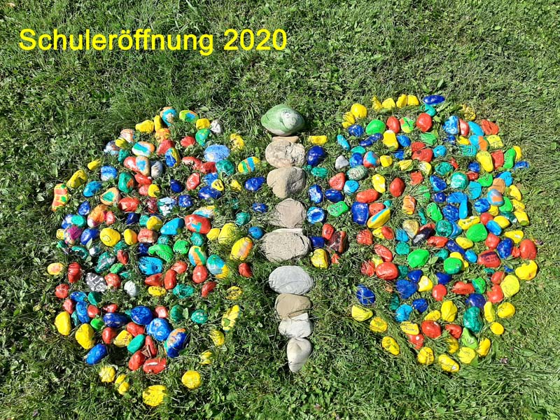 Die Raupe der Dankbarkeit, welche im Verlauf des Sommers aus bemalten Steinen entstand, wandelte sich an der Eröffnungsfeier zu einem bunten Schmetterling. Alle Beteiligten durften sich einen Dankbarkeits-Stein nehmen, der sie nun im neuen Schuljahr begleiten wird.
